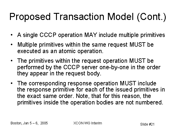 Proposed Transaction Model (Cont.) A single CCCP operation MAY include multiple primitives Multiple primitives within the same request MUST be executed as an atomic operation. The primitives within the request operation MUST be performed by the CCCP server one-by-one in the order they appear in the request body. The corresponding response operation MUST include the response primitive for each of the issued primitives in the exact same order. Note, that for this reason, the primitives inside the operation bodies are not numbered. |
