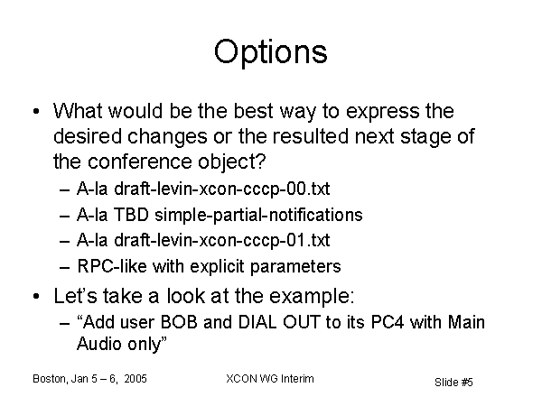 Options What would be the best way to express the desired changes or the resulted next stage of the conference object? A-la draft-levin-xcon-cccp-00.txt A-la TBD simple-partial-notifications A-la draft-levin-xcon-cccp-01.txt RPC-like with explicit parameters Let’s take a look at the example: “Add user BOB and DIAL OUT to its PC4 with Main Audio only” |