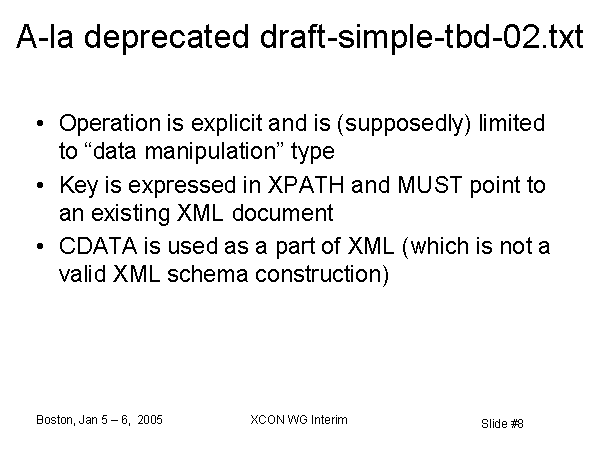 A-la deprecated draft-simple-tbd-02.txt Operation is explicit and is (supposedly) limited to “data manipulation” type Key is expressed in XPATH and MUST point to an existing XML document CDATA is used as a part of XML (which is not a valid XML schema construction) |
