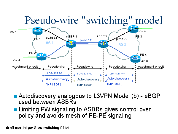 Pseudo-wire "switching" model AS 1 AS 2 AC 1 AC 3 AC 4 AC 6 ASBR-1 ASBR-2 PE-1 PE-2 PE-3 PE-4 Pseudowire Pseudowire Attachment circuit LDP / L2TPv3 LDP / L2TPv3 Auto-discovery (MP-iBGP) Autodiscovery analogous to L3VPN Model (b) - eBGP used between ASBRs Limiting PW signaling to ASBRs gives control over policy and avoids mesh of PE-PE signaling Attachment circuit Auto-discovery (MP-iBGP) pwid 34 pwid 111 Auto-discovery (MP-eBGP) Pseudowire LDP / L2TPv3 pwid 78 draft-martini-pwe3-pw-switching-01.txt |
