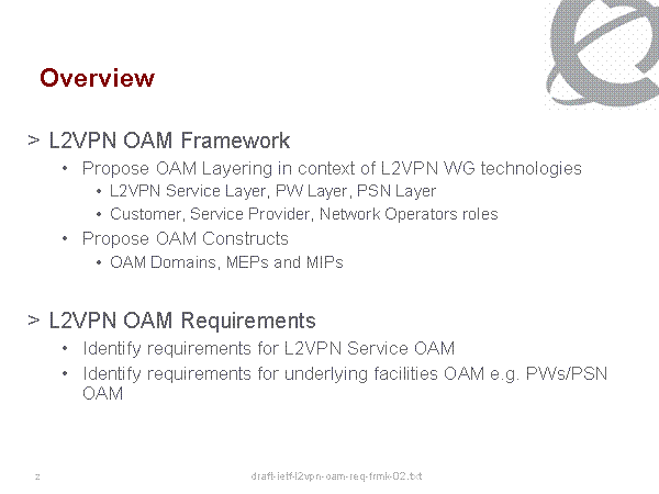 Overview L2VPN OAM Framework Propose OAM Layering in context of L2VPN WG technologies L2VPN Service Layer, PW Layer, PSN Layer Customer, Service Provider, Network Operators roles Propose OAM Constructs OAM Domains, MEPs and MIPs L2VPN OAM Requirements Identify requirements for L2VPN Service OAM Identify requirements for underlying facilities OAM e.g. PWs/PSN OAM |