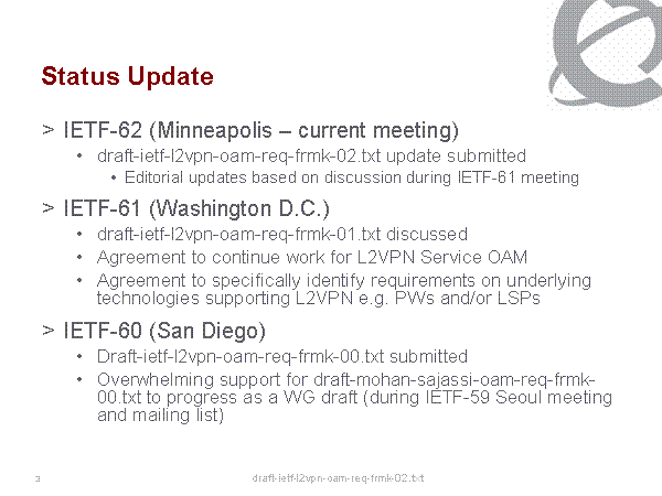 Status Update IETF-62 (Minneapolis – current meeting) draft-ietf-l2vpn-oam-req-frmk-02.txt update submitted Editorial updates based on discussion during IETF-61 meeting IETF-61 (Washington D.C.) draft-ietf-l2vpn-oam-req-frmk-01.txt discussed Agreement to continue work for L2VPN Service OAM Agreement to specifically identify requirements on underlying technologies supporting L2VPN e.g. PWs and/or LSPs IETF-60 (San Diego) Draft-ietf-l2vpn-oam-req-frmk-00.txt submitted Overwhelming support for draft-mohan-sajassi-oam-req-frmk-00.txt to progress as a WG draft (during IETF-59 Seoul meeting and mailing list) |