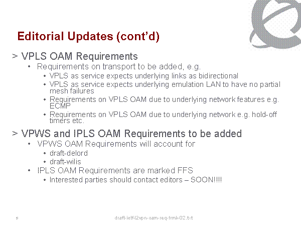 Editorial Updates (cont’d) VPLS OAM Requirements Requirements on transport to be added, e.g. VPLS as service expects underlying links as bidirectional VPLS as service expects underlying emulation LAN to have no partial mesh failures Requirements on VPLS OAM due to underlying network features e.g. ECMP Requirements on VPLS OAM due to underlying network e.g. hold-off timers etc. VPWS and IPLS OAM Requirements to be added VPWS OAM Requirements will account for draft-delord draft-wilis IPLS OAM Requirements are marked FFS Interested parties should contact editors – SOON!!!! |