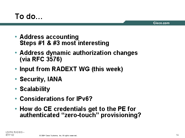 To do… Address accountingSteps #1 & #3 most interesting Address dynamic authorization changes (via RFC 3576) Input from RADEXT WG (this week) Security, IANA Scalability Considerations for IPv6? How do CE credentials get to the PE for authenticated “zero-touch” provisioning? |