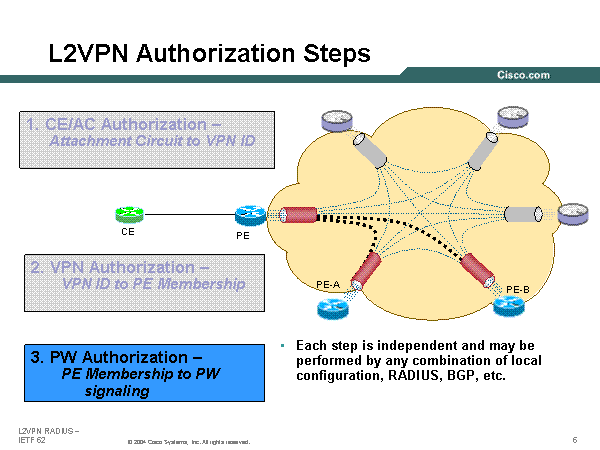 1. CE/AC Authorization – Attachment Circuit to VPN ID 2. VPN Authorization – VPN ID to PE Membership 3. PW Authorization – PE Membership to PW signaling L2VPN Authorization Steps CE PE Each step is independent and may be performed by any combination of local configuration, RADIUS, BGP, etc. PE-A PE-B |