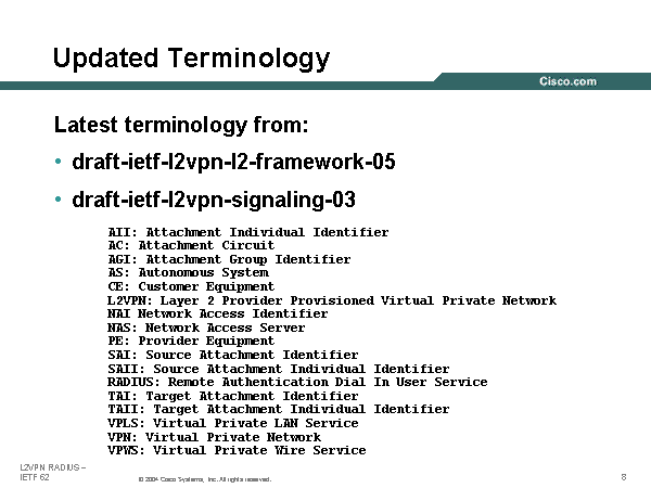 AII: Attachment Individual Identifier AC: Attachment Circuit AGI: Attachment Group Identifier AS: Autonomous System CE: Customer Equipment L2VPN: Layer 2 Provider Provisioned Virtual Private Network NAI Network Access Identifier NAS: Network Access Server PE: Provider Equipment SAI: Source Attachment Identifier SAII: Source Attachment Individual Identifier RADIUS: Remote Authentication Dial In User Service TAI: Target Attachment Identifier TAII: Target Attachment Individual Identifier VPLS: Virtual Private LAN Service VPN: Virtual Private Network VPWS: Virtual Private Wire Service Updated Terminology Latest terminology from: draft-ietf-l2vpn-l2-framework-05 draft-ietf-l2vpn-signaling-03 |