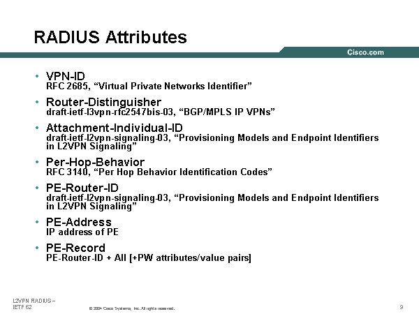 RADIUS Attributes VPN-IDRFC 2685, “Virtual Private Networks Identifier” Router-Distinguisherdraft-ietf-l3vpn-rfc2547bis-03, “BGP/MPLS IP VPNs” Attachment-Individual-IDdraft-ietf-l2vpn-signaling-03, “Provisioning Models and Endpoint Identifiers in L2VPN Signaling” Per-Hop-BehaviorRFC 3140, “Per Hop Behavior Identification Codes” PE-Router-IDdraft-ietf-l2vpn-signaling-03, “Provisioning Models and Endpoint Identifiers in L2VPN Signaling” PE-AddressIP address of PE PE-RecordPE-Router-ID + AII [+PW attributes/value pairs] |