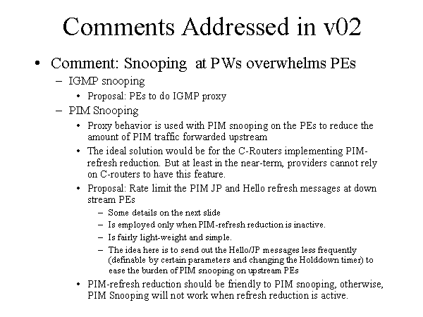 Comments Addressed in v02 Comment: Snooping at PWs overwhelms PEs IGMP snooping Proposal: PEs to do IGMP proxy PIM Snooping Proxy behavior is used with PIM snooping on the PEs to reduce the amount of PIM traffic forwarded upstream The ideal solution would be for the C-Routers implementing PIM-refresh reduction. But at least in the near-term, providers cannot rely on C-routers to have this feature. Proposal: Rate limit the PIM JP and Hello refresh messages at down stream PEs Some details on the next slide Is employed only when PIM-refresh reduction is inactive. Is fairly light-weight and simple. The idea here is to send out the Hello/JP messages less frequently (definable by certain parameters and changing the Holddown timer) to ease the burden of PIM snooping on upstream PEs PIM-refresh reduction should be friendly to PIM snooping, otherwise, PIM Snooping will not work when refresh reduction is active. |