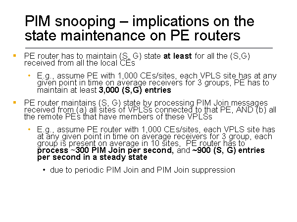 PIM snooping – implications on the state maintenance on PE routers PE router has to maintain (S, G) state at least for all the (S,G) received from all the local CEs E.g., assume PE with 1,000 CEs/sites, each VPLS site has at any given point in time on average receivers for 3 groups, PE has to maintain at least 3,000 (S,G) entries PE router maintains (S, G) state by processing PIM Join messages received from (a) all sites of VPLSs connected to that PE, AND (b) all the remote PEs that have members of these VPLSs E.g., assume PE router with 1,000 CEs/sites, each VPLS site has at any given point in time on average receivers for 3 group, each group is present on average in 10 sites, PE router has to process ~300 PIM Join per second, and ~900 (S, G) entries per second in a steady state due to periodic PIM Join and PIM Join suppression |