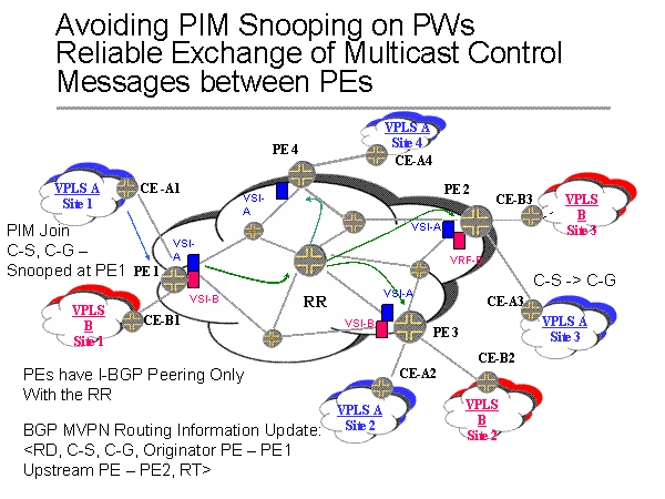 Avoiding PIM Snooping on PWs Reliable Exchange of Multicast Control Messages between PEs PE 1 CE-B2 CE-B3 PE 3 PE 2 PE 4 VPLS A Site 3 CE -A1 CE-B1 CE-A2 CE-A4 CE-A3 VPLS B Site 1 VPLS B Site 2 VPLS A Site 4 VPLS B Site 3 VSI-A VSI-A VSI-A VSI-B VSI-B VRF-B VPLS A Site 2 VPLS A Site 1 VSI-A RR PEs have I-BGP Peering Only With the RR C-S -> C-G PIM Join C-S, C-G – Snooped at PE1 BGP MVPN Routing Information Update: |