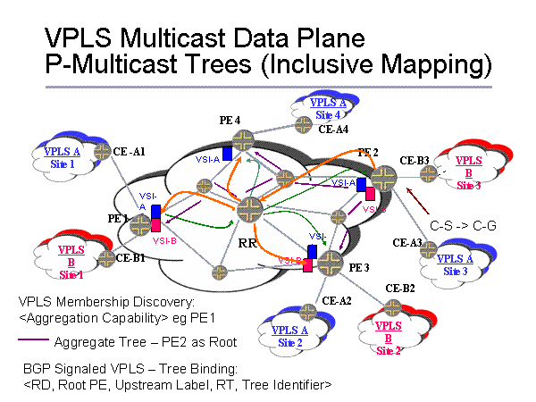 VPLS Multicast Data PlaneP-Multicast Trees (Inclusive Mapping) PE 1 CE-B2 CE-B3 PE 3 PE 2 PE 4 VPLS A Site 3 CE -A1 CE-B1 CE-A2 CE-A4 CE-A3 VPLS B Site 1 VPLS B Site 2 VPLS A Site 4 VPLS B Site 3 VSI-A VSI-A VSI-A VSI-B VSI-B VSI-B VPLS A Site 2 VPLS A Site 1 VSI-A RR VPLS Membership Discovery: C-S -> C-G Aggregate Tree – PE2 as Root BGP Signaled VPLS – Tree Binding: |