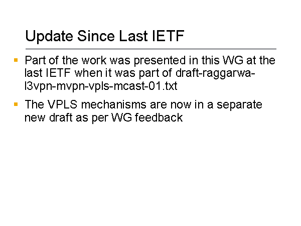 Part of the work was presented in this WG at the last IETF when it was part of draft-raggarwa-l3vpn-mvpn-vpls-mcast-01.txt