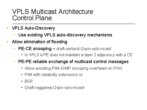 VPLS Multicast ArchitectureControl Plane VPLS Auto-Discovery Use existing VPLS auto-discovery mechanisms Allow elimination of flooding PE-CE snooping – draft-serbest-l2vpn-vpls-mcast In VPLS a PE does not maintain a layer 2 adjacency with a CE PE-PE reliable exchange of multicast control messages Allow avoiding PIM-IGMP snooping overhead on PWs PIM with reliability extensions or BGP Draft-raggarwa-l2vpn-vpls-mcast- |