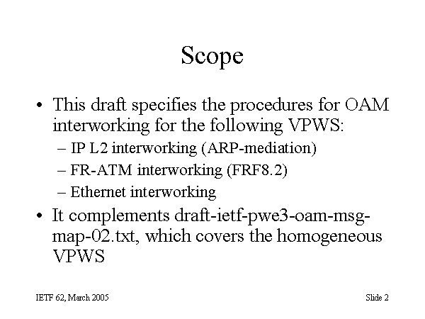 Scope This draft specifies the procedures for OAM interworking for the following VPWS: IP L2 interworking (ARP-mediation) FR-ATM interworking (FRF8.2) Ethernet interworking It complements draft-ietf-pwe3-oam-msg-map-02.txt, which covers the homogeneous VPWS |