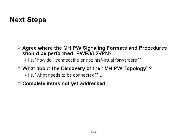 Next Steps Agree where the MH PW Signaling Formats and Procedures should be performed: PWE3/L2VPN? i.e. “how do I connect the endpoints/virtual forwarders?” What about the Discovery of the “MH PW Topology”? i.e. “what needs to be connected”?… Complete items not yet addressed |