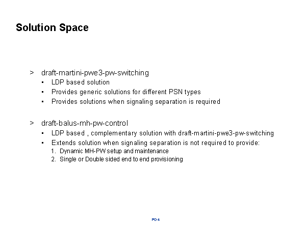 Solution Space draft-martini-pwe3-pw-switching LDP based solution Provides generic solutions for different PSN types Provides solutions when signaling separation is required draft-balus-mh-pw-control LDP based , complementary solution with draft-martini-pwe3-pw-switching Extends solution when signaling separation is not required to provide: Dynamic MH-PW setup and maintenance Single or Double sided end to end provisioning |