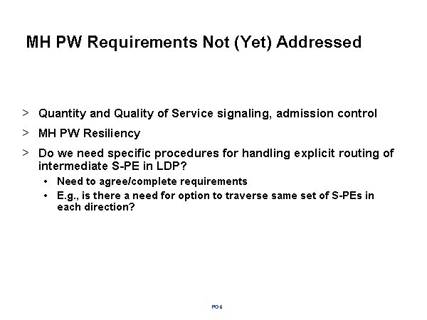 MH PW Requirements Not (Yet) Addressed Quantity and Quality of Service signaling, admission control MH PW Resiliency Do we need specific procedures for handling explicit routing of intermediate S-PE in LDP? Need to agree/complete requirements E.g., is there a need for option to traverse same set of S-PEs in each direction? |