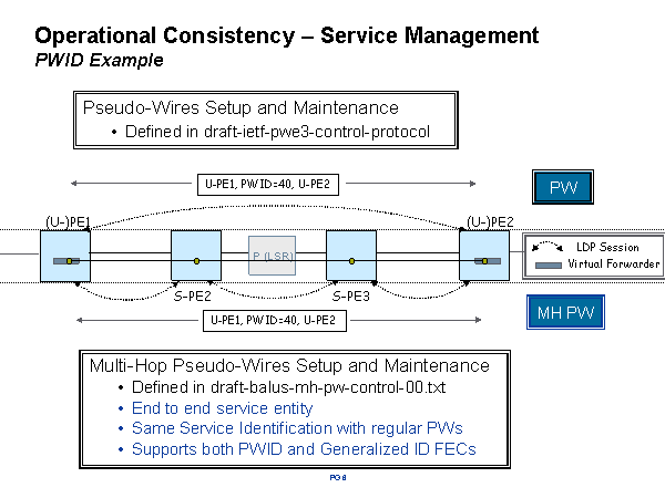 Operational Consistency – Service ManagementPWID Example P (LSR) (U-)PE1 S-PE2 (U-)PE2 S-PE3 U-PE1, PWID=40, U-PE2 Multi-Hop Pseudo-Wires Setup and Maintenance Defined in draft-balus-mh-pw-control-00.txt End to end service entity Same Service Identification with regular PWs Supports both PWID and Generalized ID FECs LDP Session Virtual Forwarder U-PE1, PWID=40, U-PE2 PW MH PW Pseudo-Wires Setup and Maintenance Defined in draft-ietf-pwe3-control-protocol |