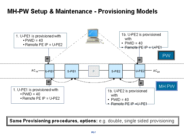 MH-PW Setup & Maintenance - Provisioning Models U-PE1 S-PE1 S-PE2 AC11 P AC21 40 40 U-PE2 Same Provisioning procedures, options: e.g. double, single sided provisioning 1b. U-PE2 is provisioned with PWID = 40 Remote PE IP = U-PE1 MH PW 1. U-PE1 is provisioned with PWID = 40 Remote PE IP = U-PE2 1b. U-PE2 is provisioned with PWID = 40 Remote PE IP =U-PE1 1. U-PE1 is provisioned with PWID = 40 Remote PE IP = U-PE2 40 40 PW |