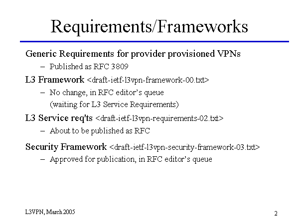 Requirements/Frameworks Generic Requirements for provider provisioned VPNs Published as RFC 3809 L3 Framework No change, in RFC editor’s queue (waiting for L3 Service Requirements) L3 Service req'ts About to be published as RFC Security Framework Approved for publication, in RFC editor’s queue |