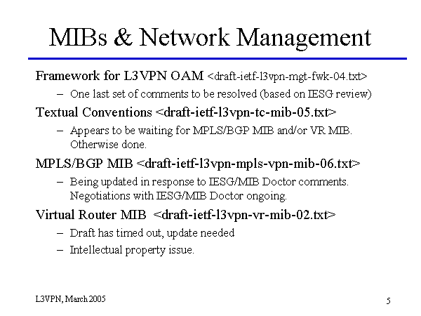 MIBs & Network Management Framework for L3VPN OAM One last set of comments to be resolved (based on IESG review) Textual Conventions Appears to be waiting for MPLS/BGP MIB and/or VR MIB. Otherwise done. MPLS/BGP MIB Being updated in response to IESG/MIB Doctor comments. Negotiations with IESG/MIB Doctor ongoing. Virtual Router MIB Draft has timed out, update needed Intellectual property issue. |
