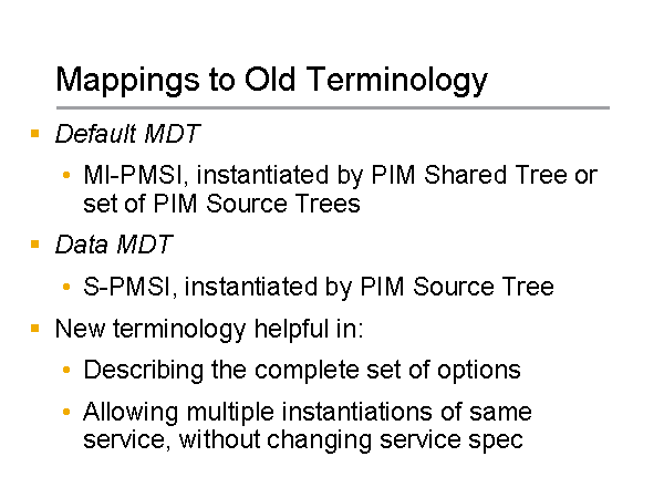 Mappings to Old Terminology Default MDT MI-PMSI, instantiated by PIM Shared Tree or set of PIM Source Trees Data MDT S-PMSI, instantiated by PIM Source Tree New terminology helpful in: Describing the complete set of options Allowing multiple instantiations of same service, without changing service spec |