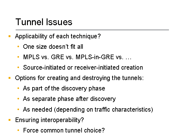 Tunnel Issues Applicability of each technique? One size doesn’t fit all MPLS vs. GRE vs. MPLS-in-GRE vs. … Source-initiated or receiver-initiated creation Options for creating and destroying the tunnels: As part of the discovery phase As separate phase after discovery As needed (depending on traffic characteristics) Ensuring interoperability? Force common tunnel choice? |