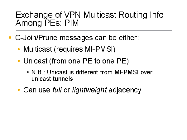 Exchange of VPN Multicast Routing Info Among PEs: PIM C-Join/Prune messages can be either: Multicast (requires MI-PMSI) Unicast (from one PE to one PE) N.B.: Unicast is different from MI-PMSI over unicast tunnels Can use full or lightweight adjacency |
