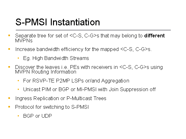 S-PMSI Instantiation Separate tree for set of Increase bandwidth efficiency for the mapped Eg. High Bandwidth Streams Discover the leaves i.e. PEs with receivers in For RSVP-TE P2MP LSPs or/and Aggregation Unicast PIM or BGP or MI-PMSI with Join Suppression off Ingress Replication or P-Multicast Trees Protocol for switching to S-PMSI BGP or UDP |