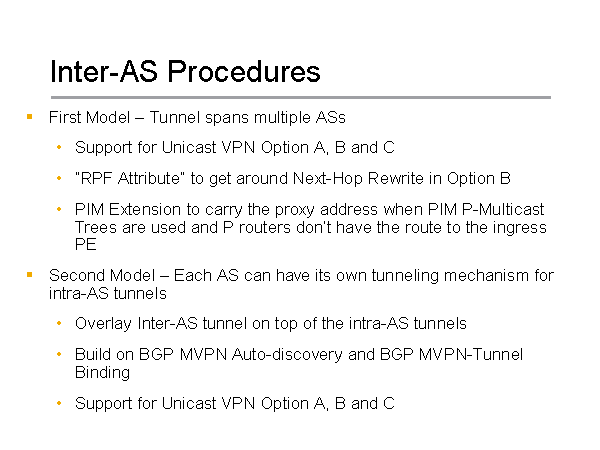 Inter-AS Procedures First Model – Tunnel spans multiple ASs Support for Unicast VPN Option A, B and C “RPF Attribute” to get around Next-Hop Rewrite in Option B PIM Extension to carry the proxy address when PIM P-Multicast Trees are used and P routers don’t have the route to the ingress PE Second Model – Each AS can have its own tunneling mechanism for intra-AS tunnels Overlay Inter-AS tunnel on top of the intra-AS tunnels Build on BGP MVPN Auto-discovery and BGP MVPN-Tunnel Binding Support for Unicast VPN Option A, B and C |
