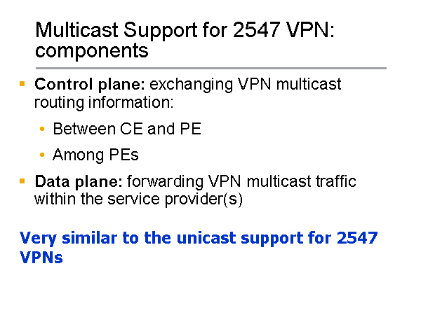 Multicast Support for 2547 VPN: components Control plane: exchanging VPN multicast routing information: Between CE and PE Among PEs Data plane: forwarding VPN multicast traffic within the service provider(s) Very similar to the unicast support for 2547 VPNs |