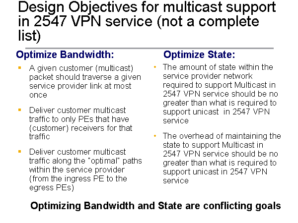 Design Objectives for multicast support in 2547 VPN service (not a complete list) A given customer (multicast) packet should traverse a given service provider link at most once Deliver customer multicast traffic to only PEs that have (customer) receivers for that traffic Deliver customer multicast traffic along the “optimal” paths within the service provider (from the ingress PE to the egress PEs) The amount of state within the service provider network required to support Multicast in 2547 VPN service should be no greater than what is required to support unicast in 2547 VPN service The overhead of maintaining the state to support Multicast in 2547 VPN service should be no greater than what is required to support unicast in 2547 VPN service Optimize Bandwidth: Optimize State: Optimizing Bandwidth and State are conflicting goals |