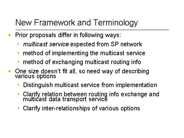 New Framework and Terminology Prior proposals differ in following ways: multicast service expected from SP network method of implementing the multicast service method of exchanging multicast routing info One size doesn’t fit all, so need way of describing various options Distinguish multicast service from implementation Clarify relation between routing info exchange and multicast data transport service Clarify inter-relationships of various options |