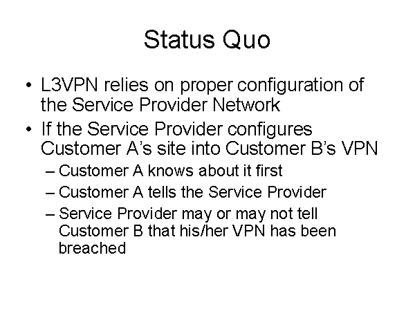 Status Quo L3VPN relies on proper configuration of the Service Provider Network If the Service Provider configures Customer A’s site into Customer B’s VPN Customer A knows about it first Customer A tells the Service Provider Service Provider may or may not tell Customer B that his/her VPN has been breached |
