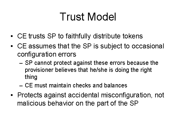 Trust Model CE trusts SP to faithfully distribute tokens CE assumes that the SP is subject to occasional configuration errors SP cannot protect against these errors because the provisioner believes that he/she is doing the right thing CE must maintain checks and balances Protects against accidental misconfiguration, not malicious behavior on the part of the SP |