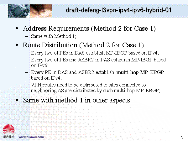 draft-defeng-l3vpn-ipv4-ipv6-hybrid-01 Address Requirements (Method 2 for Case 1) Same with Method 1; Route Distribution (Method 2 for Case 1) Every two of PEs in DAS establish MP-IBGP based on IPv4; Every two of PEs and ASBR2 in PAS establish MP-IBGP based on IPv6; Every PE in DAS and ASBR2 establish multi-hop MP-EBGP based on IPv4; VPN routes need to be distributed to sites connected to neighboring AS are distributed by such multi-hop MP-EBGP; Same with method 1 in other aspects. |