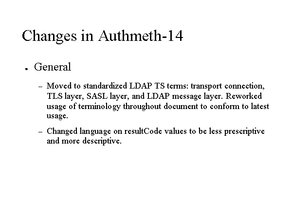 Changes in Authmeth-14 General Moved to standardized LDAP TS terms: transport connection, TLS layer, SASL layer, and LDAP message layer. Reworked usage of terminology throughout document to conform to latest usage. Changed language on resultCode values to be less prescriptive and more descriptive. |