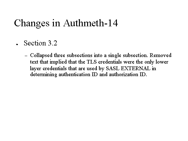Changes in Authmeth-14 Section 3.2 Collapsed three subsections into a single subsection. Removed text that implied that the TLS credentials were the only lower layer credentials that are used by SASL EXTERNAL in determining authentication ID and authorization ID. |