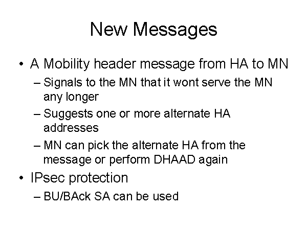 New Messages A Mobility header message from HA to MN Signals to the MN that it wont serve the MN any longer Suggests one or more alternate HA addresses MN can pick the alternate HA from the message or perform DHAAD again IPsec protection BU/BAck SA can be used |