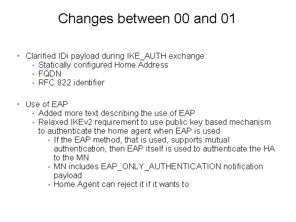 Changes between 00 and 01 Clarified IDi payload during IKE_AUTH exchange Statically configured Home Address FQDN RFC 822 identifier Use of EAP Added more text describing the use of EAP Relaxed IKEv2 requirement to use public key based mechanism to authenticate the home agent when EAP is used If the EAP method, that is used, supports mutual authentication, then EAP itself is used to authenticate the HA to the MN MN includes EAP_ONLY_AUTHENTICATION notification payload Home Agent can reject it if it wants to |