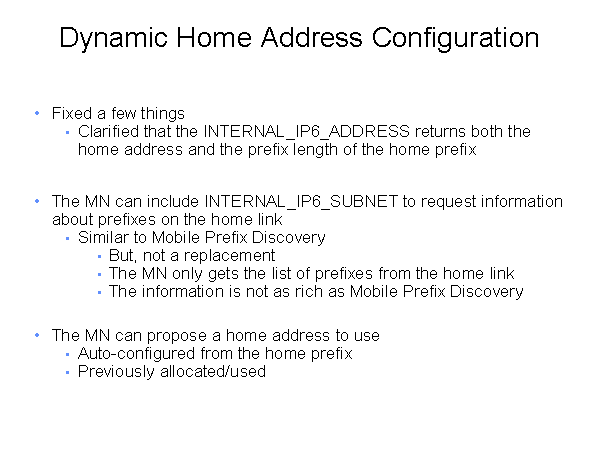 Dynamic Home Address Configuration Fixed a few things Clarified that the INTERNAL_IP6_ADDRESS returns both the home address and the prefix length of the home prefix The MN can include INTERNAL_IP6_SUBNET to request information about prefixes on the home link Similar to Mobile Prefix Discovery But, not a replacement The MN only gets the list of prefixes from the home link The information is not as rich as Mobile Prefix Discovery The MN can propose a home address to use Auto-configured from the home prefix Previously allocated/used |