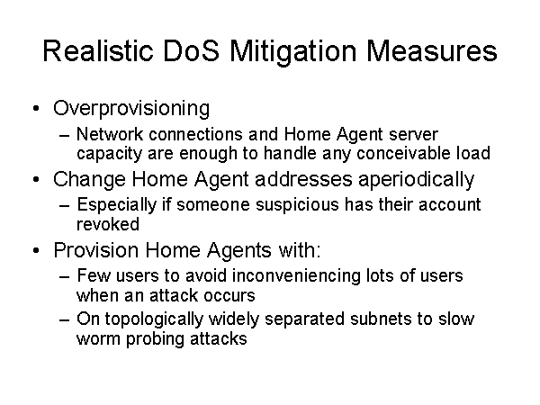 Realistic DoS Mitigation Measures Overprovisioning Network connections and Home Agent server capacity are enough to handle any conceivable load Change Home Agent addresses aperiodically Especially if someone suspicious has their account revoked Provision Home Agents with: Few users to avoid inconveniencing lots of users when an attack occurs On topologically widely separated subnets to slow worm probing attacks |