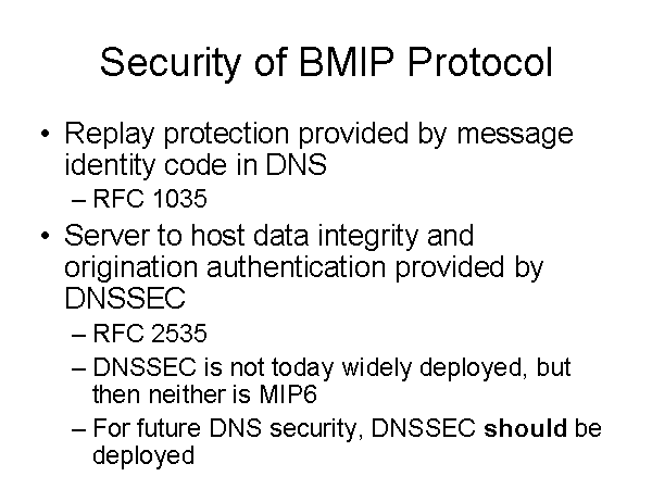 Security of BMIP Protocol Replay protection provided by message identity code in DNS RFC 1035 Server to host data integrity and origination authentication provided by DNSSEC RFC 2535 DNSSEC is not today widely deployed, but then neither is MIP6 For future DNS security, DNSSEC should be deployed |
