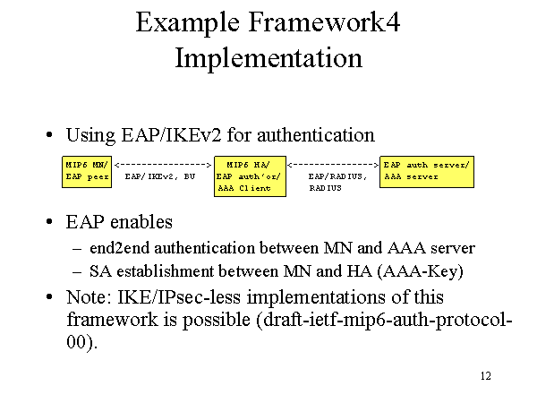 Example Framework4 Implementation Using EAP/IKEv2 for authentication MIP6 MN/ <----------------> MIP6 HA/ <---------------> EAP auth server/ EAP peer EAP/IKEv2, BU EAP auth’or/ EAP/RADIUS, AAA server AAA Client RADIUS EAP enables end2end authentication between MN and AAA server SA establishment between MN and HA (AAA-Key) Note: IKE/IPsec-less implementations of this framework is possible (draft-ietf-mip6-auth-protocol-00). |