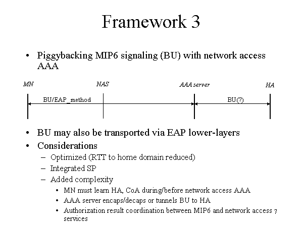 Framework 3 Piggybacking MIP6 signaling (BU) with network access AAA BU may also be transported via EAP lower-layers Considerations Optimized (RTT to home domain reduced) Integrated SP Added complexity MN must learn HA, CoA during/before network access AAA AAA server encaps/decaps or tunnels BU to HA Authorization result coordination between MIP6 and network access services MN NAS HA AAA server BU(?) BU/EAP_method |