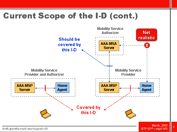 Current Scope of the I-D (cont.) Home Agent AAA-MSP Server AAA-MSA Server Mobility Service Authorizer Mobility Service Provider Home Agent AAA-MSP Server Mobility Service Provider and Authorizer Covered by this I-D Should be covered by this I-D X Not realistic |
