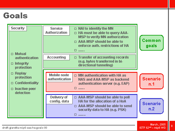Goals Security Service Authorization Accounting Mobile node authentication Mutual authentication Integrity protection Replay protection Confidentiality Inactive peer detection NAI to identify the MN HA must be able to query AAA-MSP to verify MN authorization AAA-MSP should be able to enforce auth. restrictions of HA ....... Transfer of accounting records (e.g. bytes transferred in bi-directional tunneling) Delivery of config. data MN authentication with HA as NAS and AAA-MSP as backend authentication server (e.g. EAP) ....... AAA-MSP should be able to poll HA for the allocation of a HoA AAA-MSP should be able to send security data to HA (e.g. PSK) ........ Common goals Scenario n.1 Scenario n.2 |