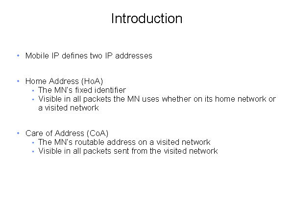 Introduction Mobile IP defines two IP addresses Home Address (HoA) The MN’s fixed identifier Visible in all packets the MN uses whether on its home network or a visited network Care of Address (CoA) The MN’s routable address on a visited network Visible in all packets sent from the visited network |