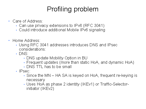 Profiling problem Care of Address: Can use privacy extensions to IPv6 (RFC 3041) Could introduce additional Mobile IPv6 signaling Home Address: Using RFC 3041 addresses introduces DNS and IPsec considerations: DNS: DNS update Mobility Option in BU Frequent updates (more than static HoA, and dynamic HoA) DNS TTL has to be small IPsec: Since the MN – HA SA is keyed on HoA, frequent re-keying is necessary Uses HoA as phase 2 identity (IKEv1) or Traffic-Selector-initiator (IKEv2) |