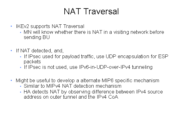 NAT Traversal IKEv2 supports NAT Traversal MN will know whether there is NAT in a visiting network before sending BU If NAT detected, and, If IPsec used for payload traffic, use UDP encapsulation for ESP packets If IPsec is not used, use IPv6-in-UDP-over-IPv4 tunneling Might be useful to develop a alternate MIP6 specific mechanism Similar to MIPv4 NAT detection mechanism HA detects NAT by observing difference between IPv4 source address on outer tunnel and the IPv4 CoA |